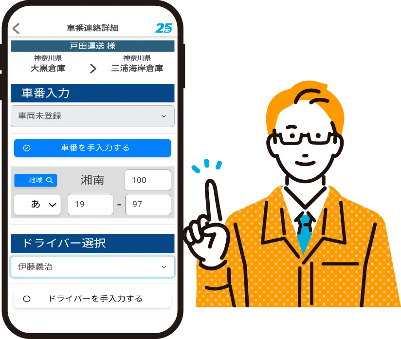 車番・ドライバー・車種・連絡先などを「ワンクリック/ワンタップ」で共有できます。